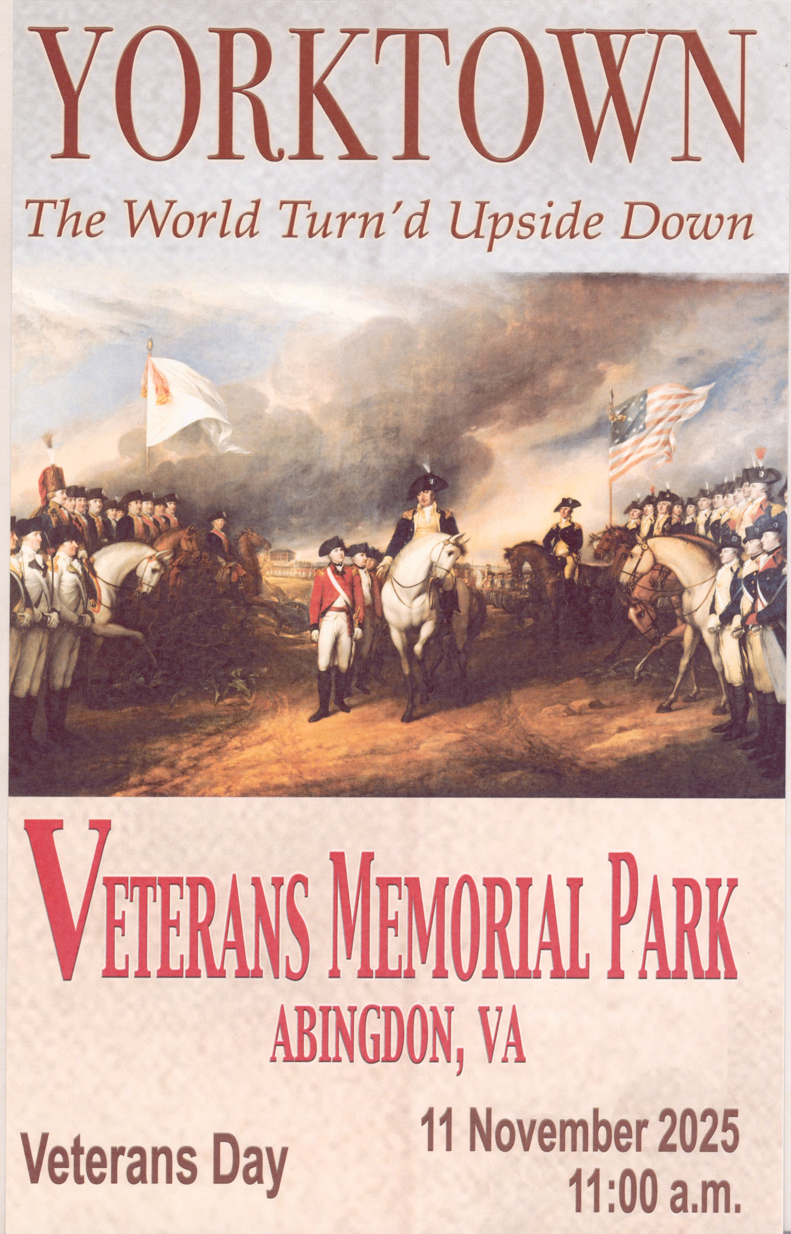 Join us on Veterans Day, November 11, 2025 at 11:00 AM at Veterans Memorial Park in Abingdon, Virginia for a special talk by the Historical Society’s President: “The World Turn’d Upside Down - The Battle of Yorktown.” This program honors America’s veterans while exploring the decisive Revolutionary War battle that secured our independence.