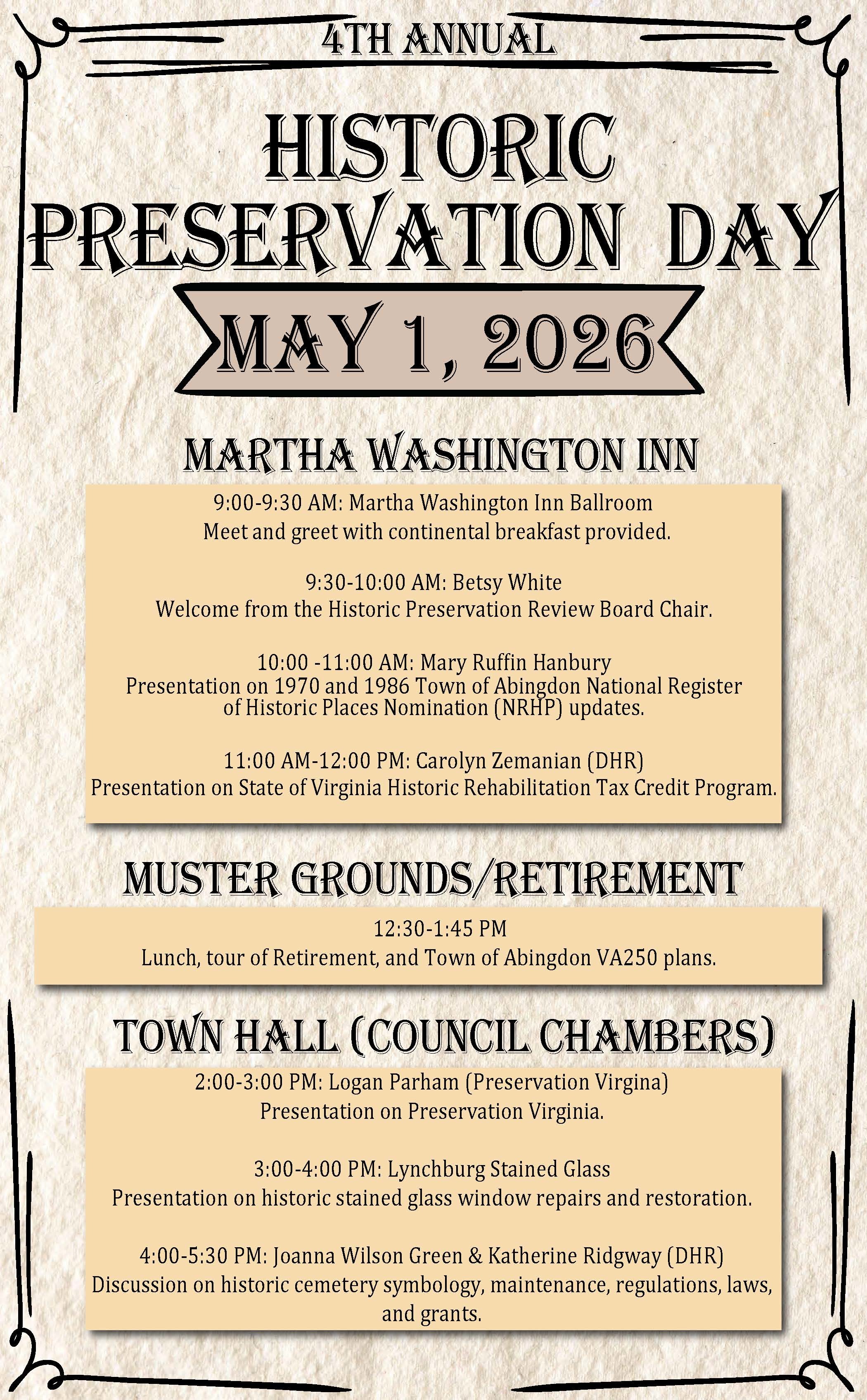 Historic Preservation Day May 1, 2026The Town of Abingdon's 4th Annual Historic Preservation Day features expert speakers, learning sessions, and a rare tour of the ongoing restoration of Retirement. The Historical Society is helping promote this event. RSVP required — food and drink provided throughout the day.
